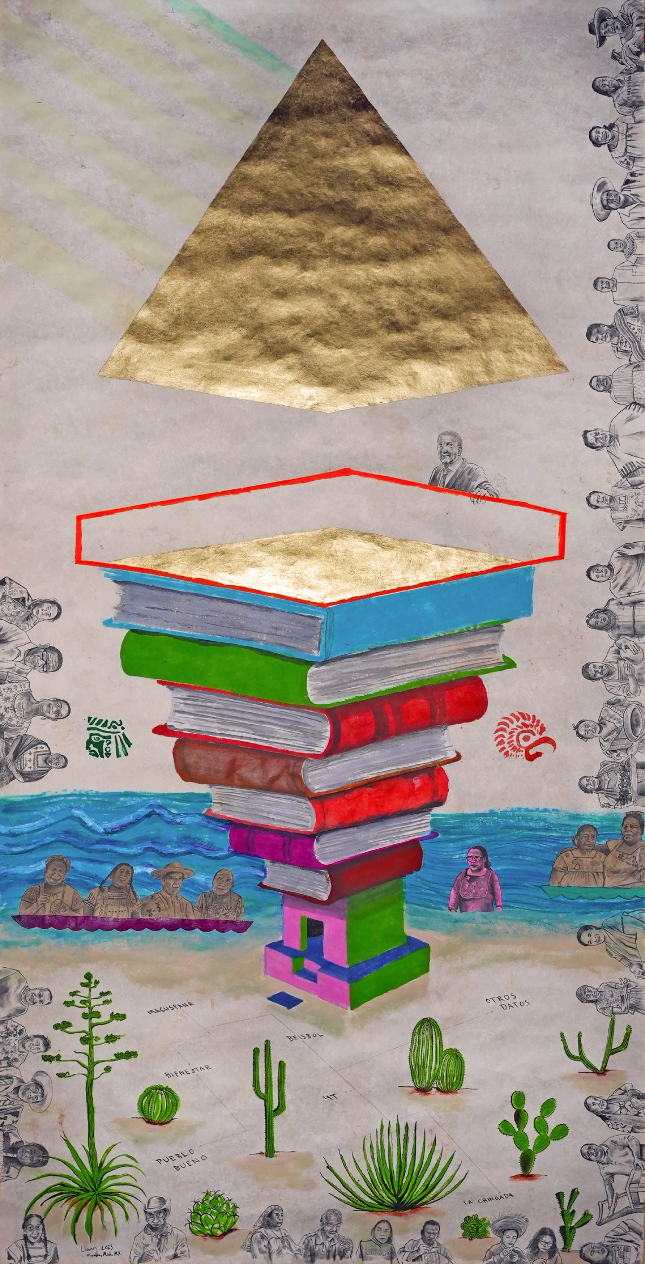 Meses después, de manera individual y sin prisas, decidí que sería justo pintar un quinto pliego de papel amate, honrando a la base de la pirámide, a esos protagonistas que, a mi parecer, faltaron en el dichoso evento. Lo titulé Códice 4T o El Peje y el pueblo bueno. En ella, aparecen 43 retratos hechos en grafito líquido, como los realizados en los cuatro pliegos anteriores, con maestros artesanos, cocineras tradicionales, y hasta una lingüista defensora del mixe, Yasnaya Aguilar, o el neólogo Felipe Ehrenberg. Al centro de la pieza, y al lado de una pirámide invertida hecha de libros (interprétese como leyes, educación o conocimiento histórico) se encuentra nuestro expresidente, Andrés Manuel López Obrador, como eje rector gracias al cual cambiaron muchas de las narrativas nacionales. El paisaje está salpimentado por varias cactáceas resilientes y coronado por una pirámide dorada iluminada con pintura fluorescente.