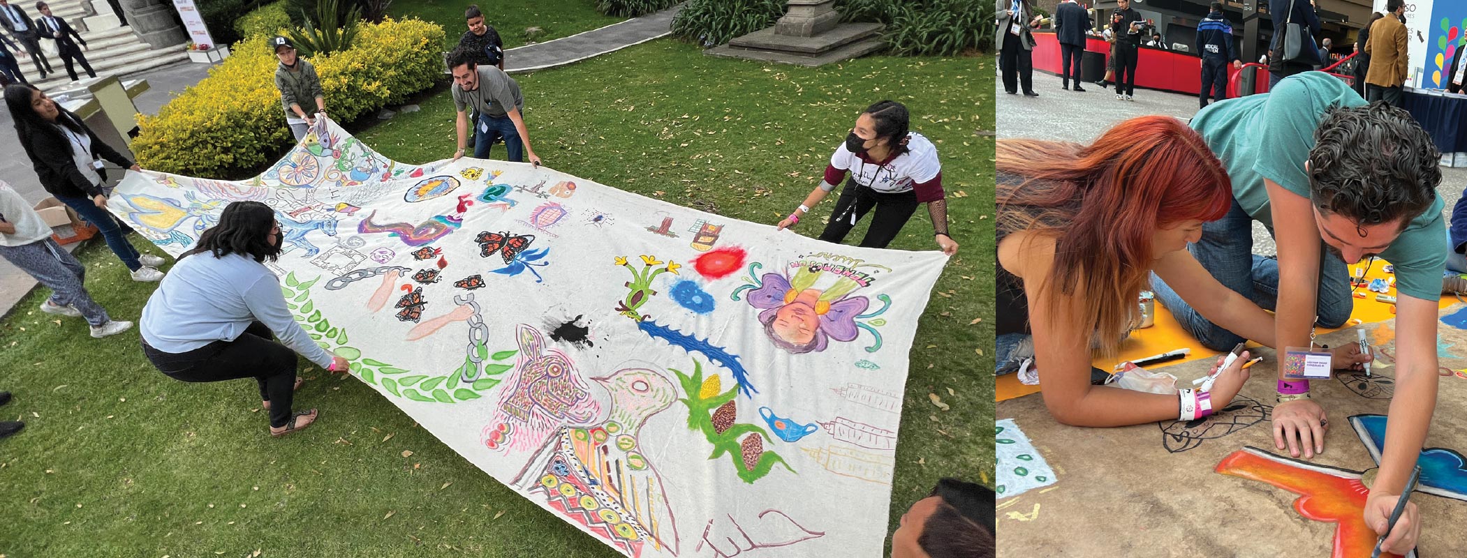La creación de este nuevo códice tuvo dos momentos. El primero se realizó durante el evento, en las dos sedes del encuentro: el Auditorio Nacional y el Complejo Cultural Los Pinos. Aliados que escuchaban las ponencias, resumían frases y nos las mandaban, vía Whatsapp, a las distintas islas de trabajo que teníamos. Entre las niñas, niños, adolescentes y tutores de los Semilleros Creativos, dibujamos y pintamos esos abstractos conceptos. Por lo difícil de aterrizar, gráficamente, temas tan complejos en tan poco tiempo, nos enfocamos, en la mayoría de los casos, en reflejar con detalle uno o dos de los conceptos que “cachábamos”.