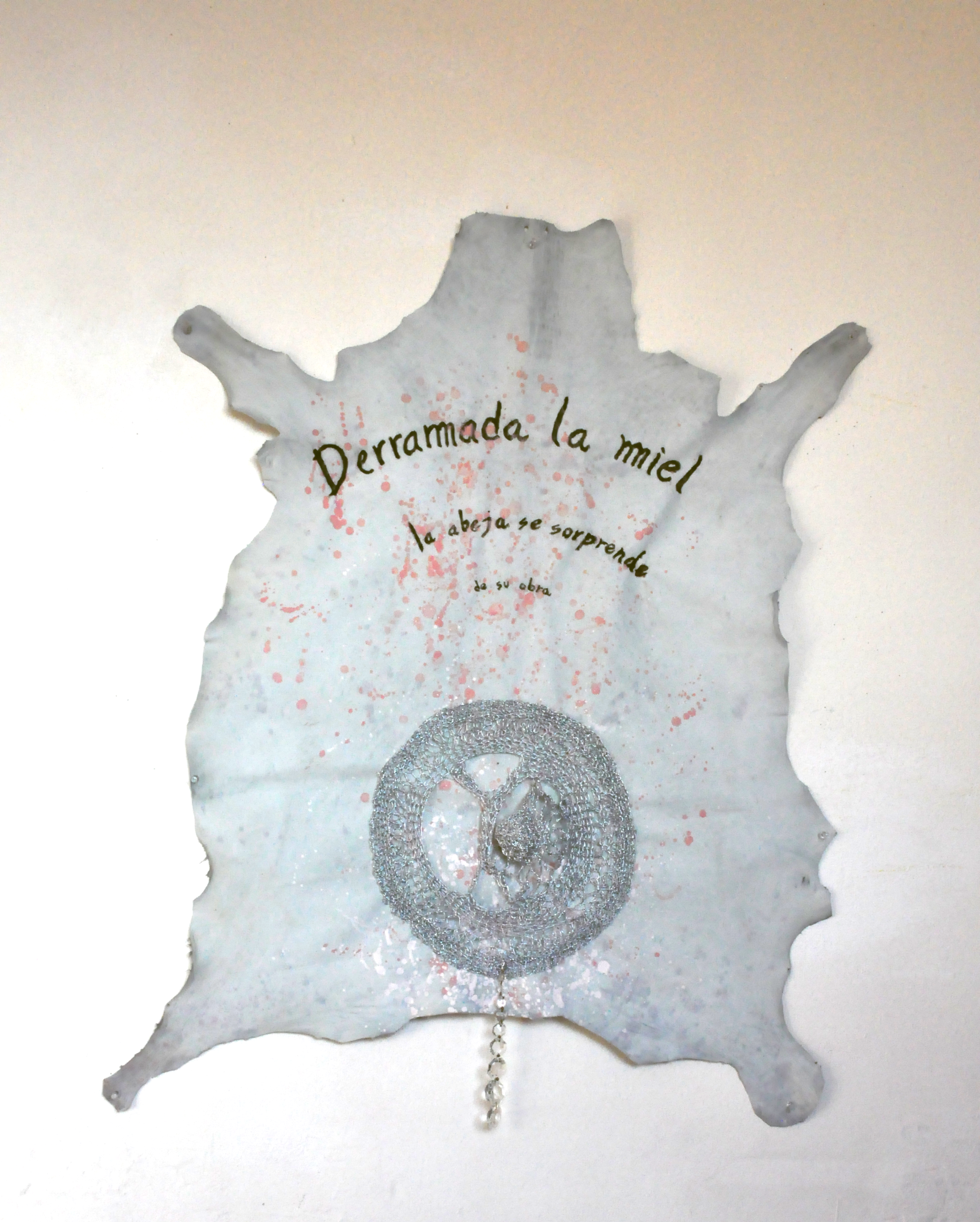 ‘Derramada la miel’, pirograbado, bordado y tejido de cordón sobre cuero de chivo, 2009. Imagen: Carmen Flores