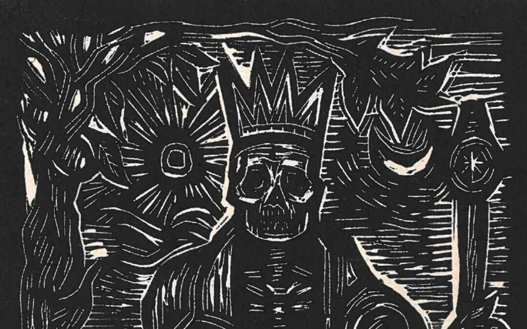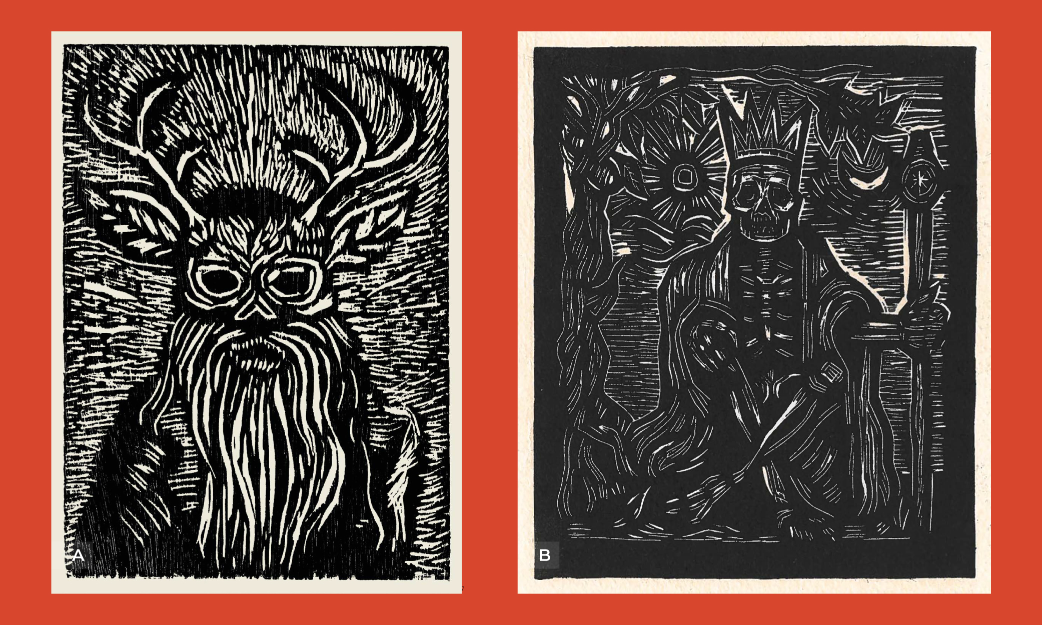A. Pío Primley, Diablito, impresión de linóleo, 2023. | B. Pío Primley, Rey San Pascual, impresión de linóleo, 2024.